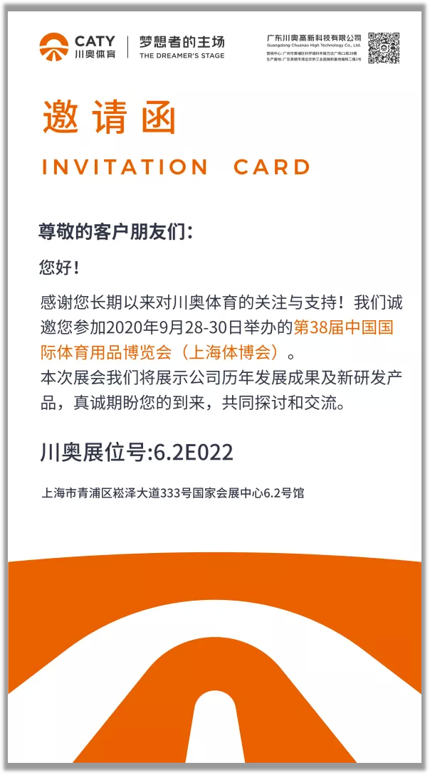 被譽為中國體育產(chǎn)業(yè)的風向標——中國國際體育用品博覽會將于9月28-30日在上海國家會展中心舉行,川奧體育誠摯地邀請您前來觀展。